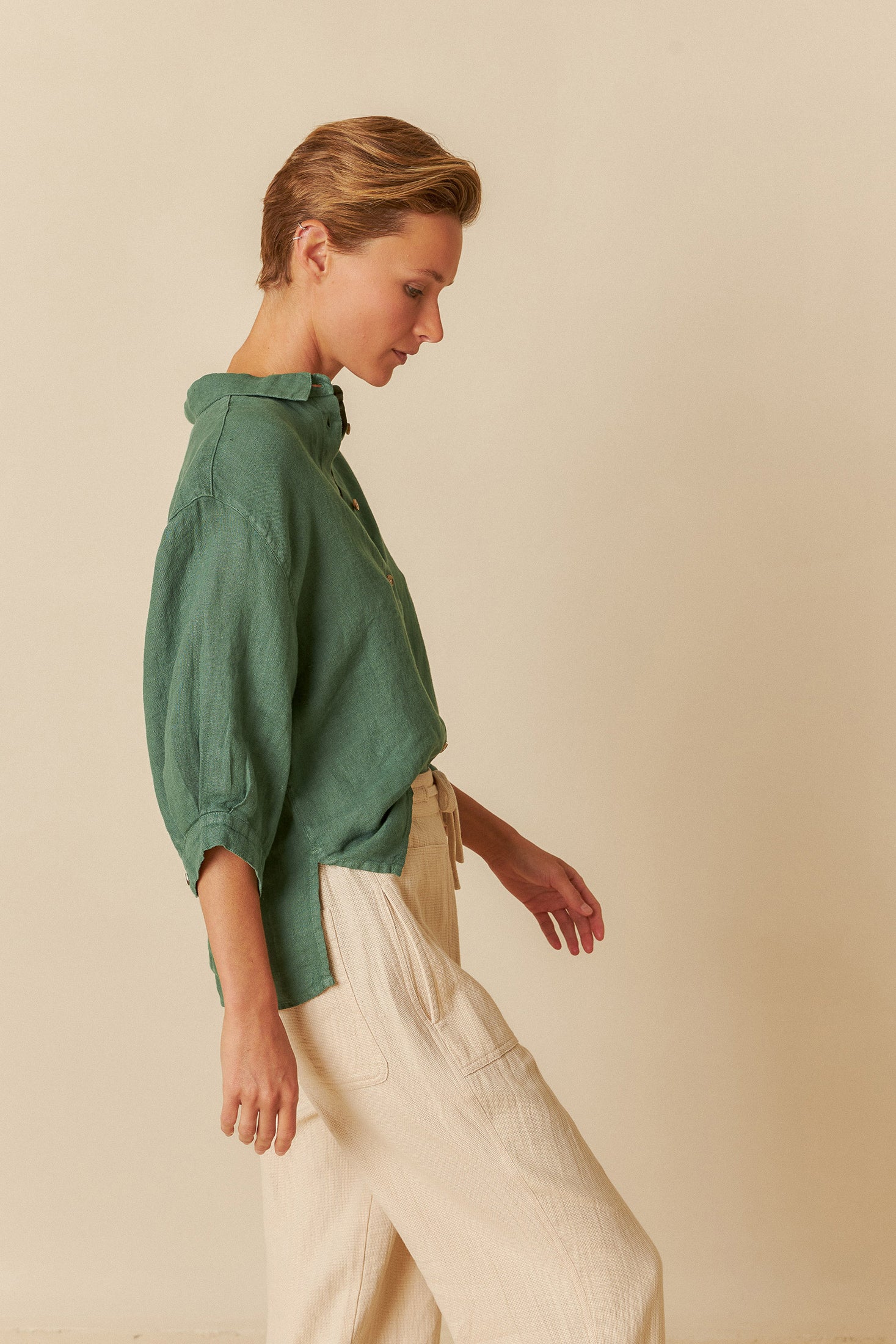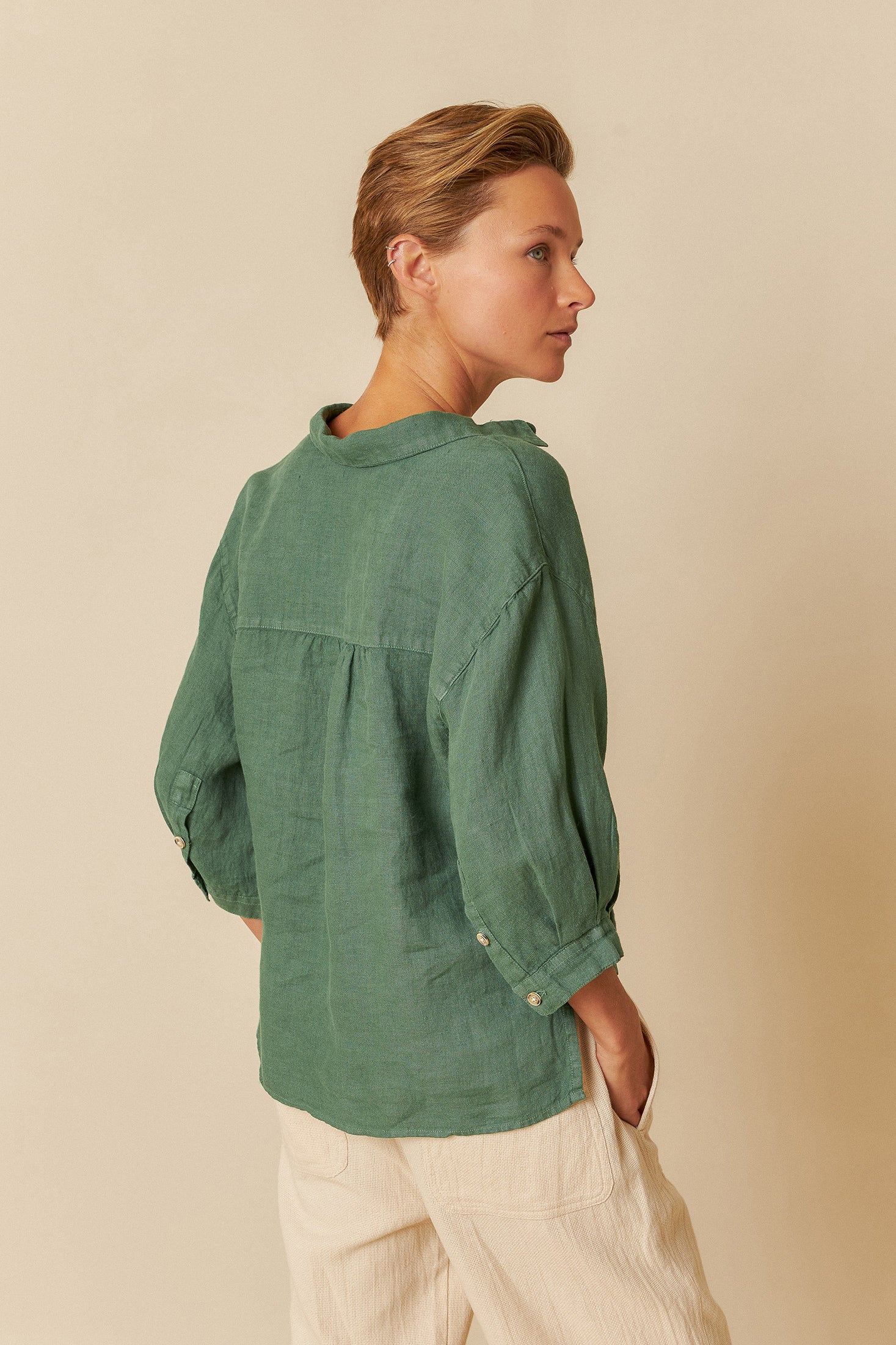 • Slightly dropped shoulders and 3/4 balloon sleeve with cuffs and button closure.
