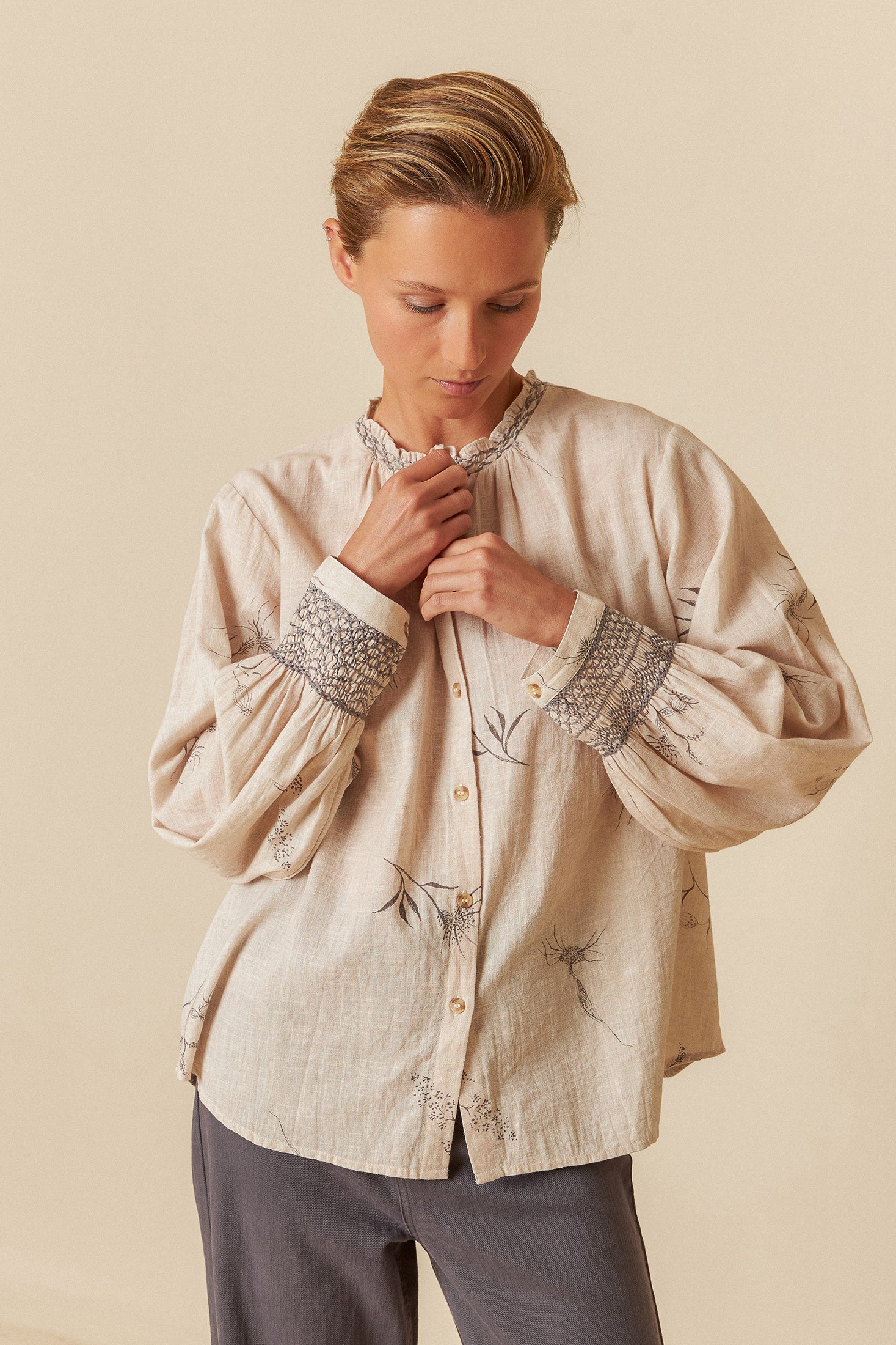 • Fitted shoulders and long balloon sleeves with handmade smock embroidery detail on cuffs.