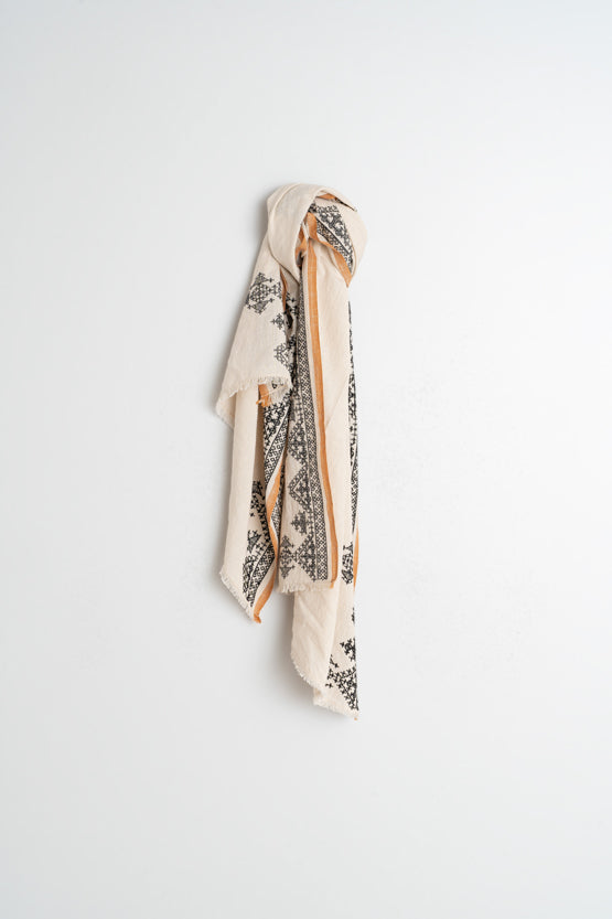• Organic cotton scarf with ethnic embroidery and frayed finish